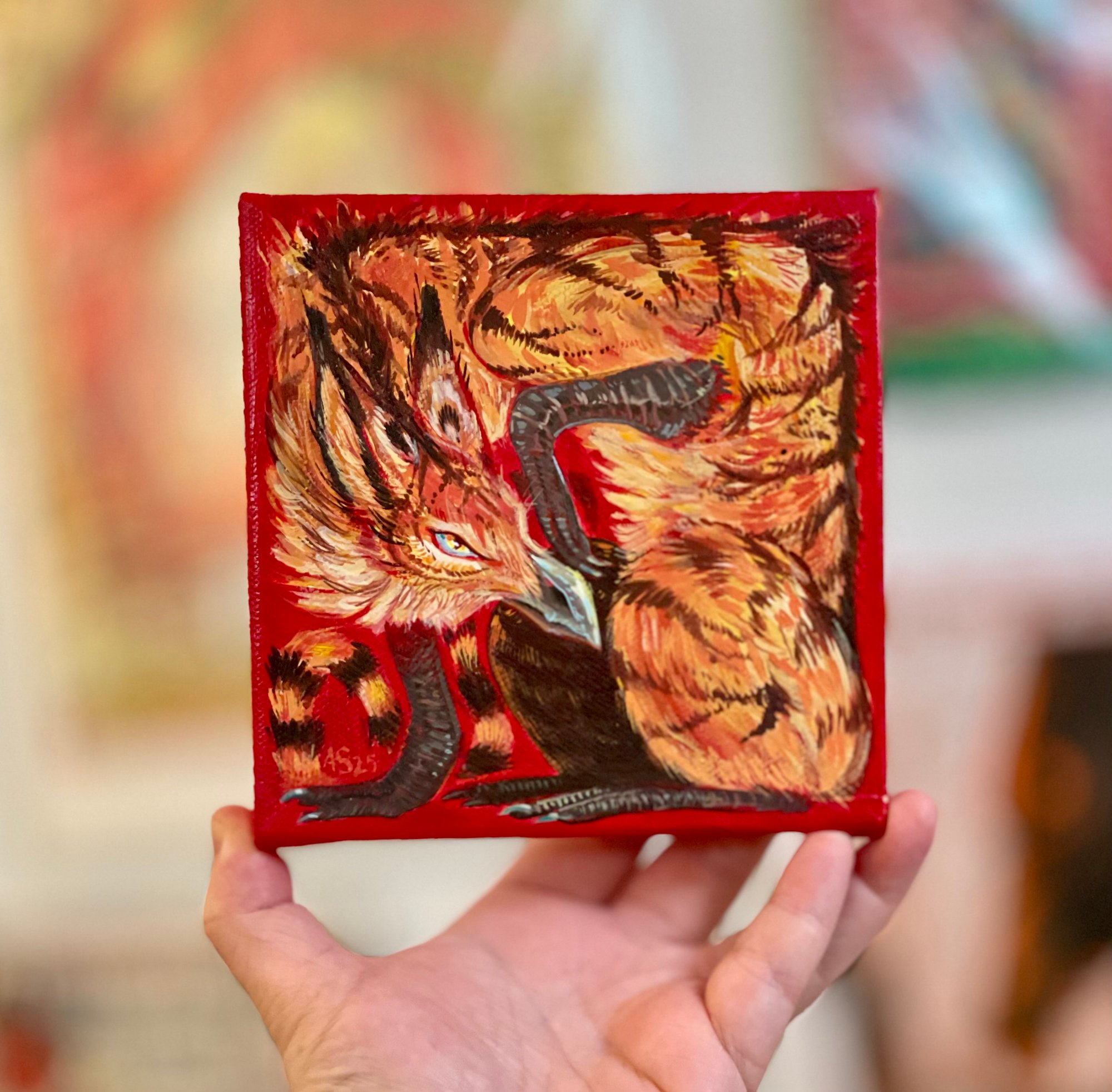 What if a gryphon were a house cat (but also patterned like a tiger)? This wingless kitty-bird seems pretty suspicious and will peer at you with a watchful eye. Thankfully, it's just a painting - made with acrylic on a 5" square stretched canvas, finished with a satin archival spray, and comes with attached hardware ready to hang on your wall.
